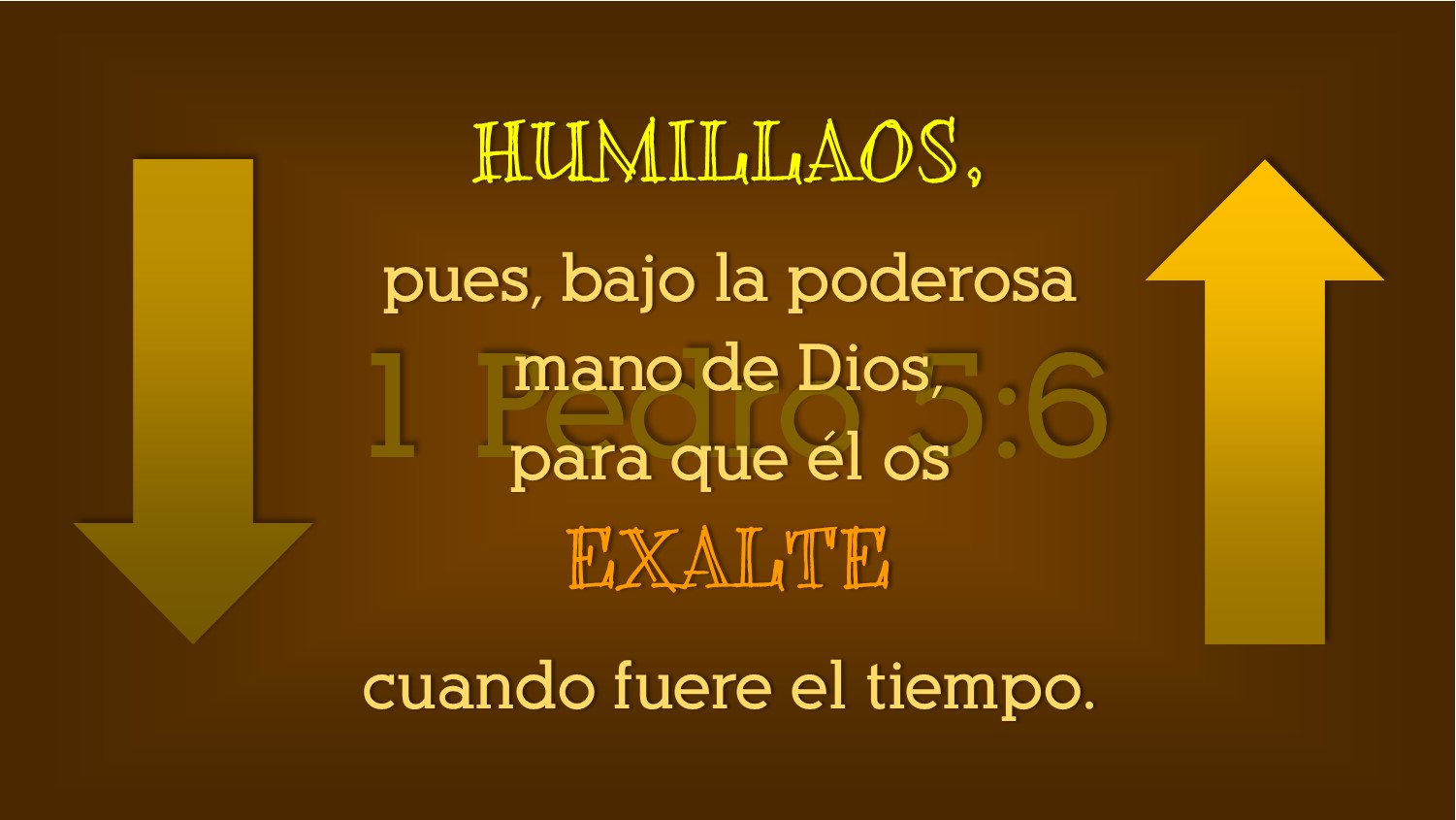 “Igualmente, jóvenes, estad sujetos a los ancianos; y todos, sumisos unos a otros, revestíos de humildad; porque: Dios resiste a los soberbios, Y da gracia a los humildes. HUMILLAOS, pues, bajo la poderosa mano de Dios, PARA QUE ÉL OS EXALTE CUANDO FUERE EL TIEMPO.”