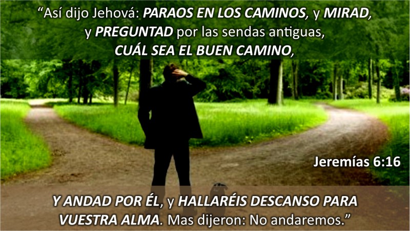 “Así dijo Jehová: PARAOS EN LOS CAMINOS, y MIRAD, y PREGUNTAD por las sendas antiguas, CUÁL SEA EL BUEN CAMINO, Y ANDAD POR ÉL, y HALLARÉIS DESCANSO PARA VUESTRA ALMA. Mas dijeron: No andaremos.”