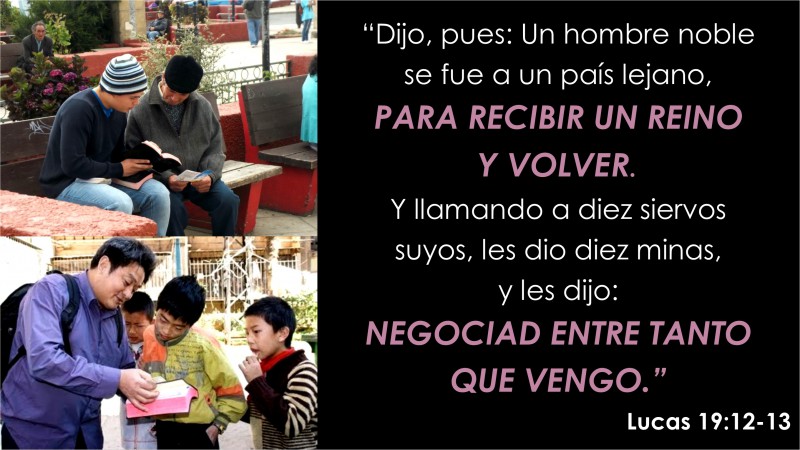 “Oyendo ellos estas cosas, prosiguió Jesús y dijo una parábola, por cuanto estaba cerca de Jerusalén, y ellos pensaban que el reino de Dios se manifestaría inmediatamente. Dijo, pues: Un hombre noble se fue a un país lejano, PARA RECIBIR UN REINO Y VOLVER. Y llamando a diez siervos suyos, les dio diez minas, y les dijo: NEGOCIAD ENTRE TANTO QUE VENGO.”