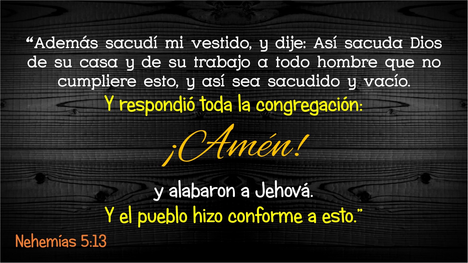 “Además sacudí mi vestido, y dije: Así sacuda Dios de su casa y de su trabajo a todo hombre que no cumpliere esto, y así sea sacudido y vacío. Y respondió toda la congregación: ¡Amén! y alabaron a Jehová. Y el pueblo hizo conforme a esto.”