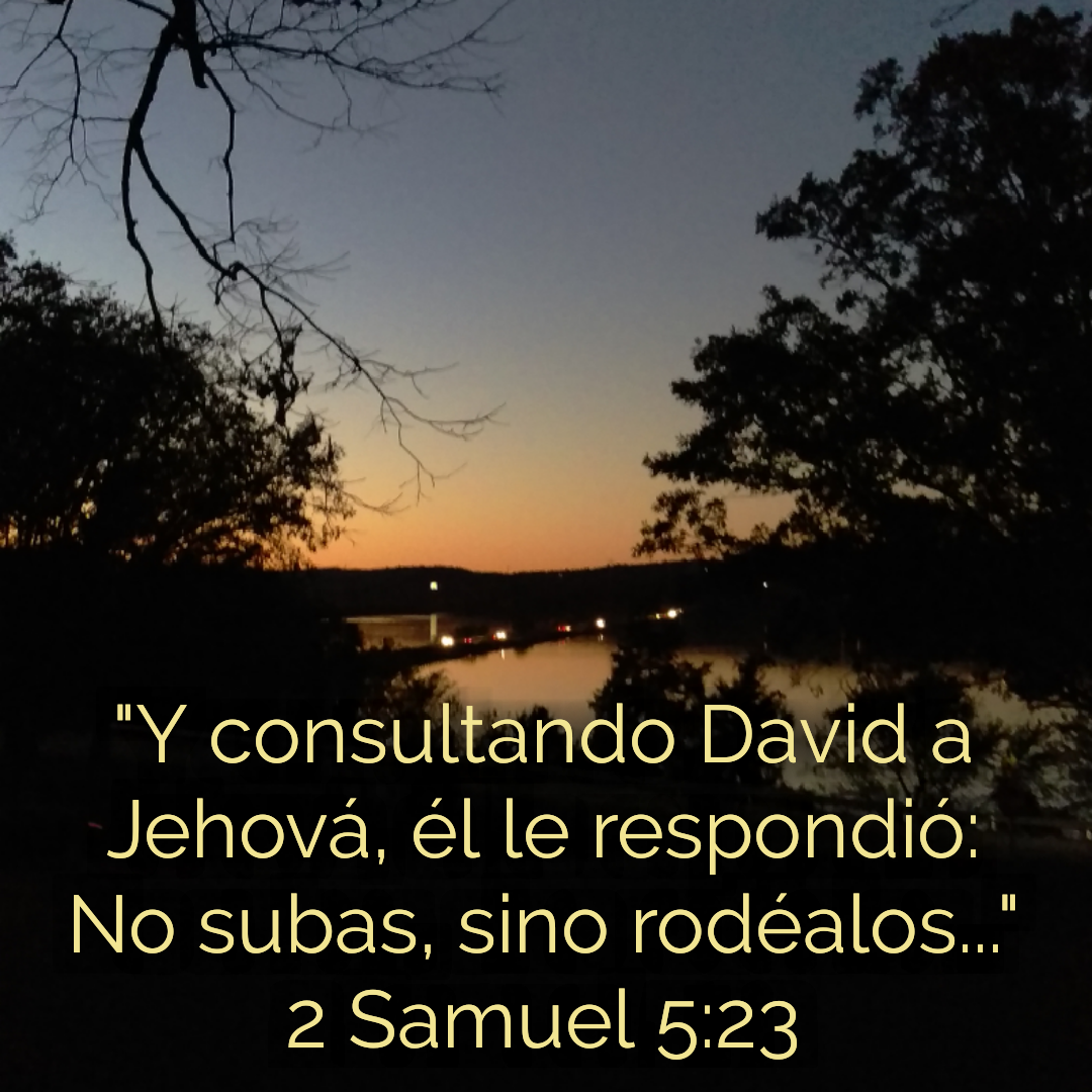 «Y los filisteos volvieron a venir, y se extendieron en el valle de Refaim. Y consultando David a Jehová, él le respondió: No subas, sino rodéalos, y vendrás a ellos enfrente de las balsameras. Y cuando oigas ruido como de marcha por las copas de las balsameras, entonces te moverás; porque Jehová saldrá delante de ti a herir el campamento de los filisteos. Y David lo hizo así, como Jehová se lo había mandado; e hirió a los filisteos desde Geba hasta llegar a Gezer.»