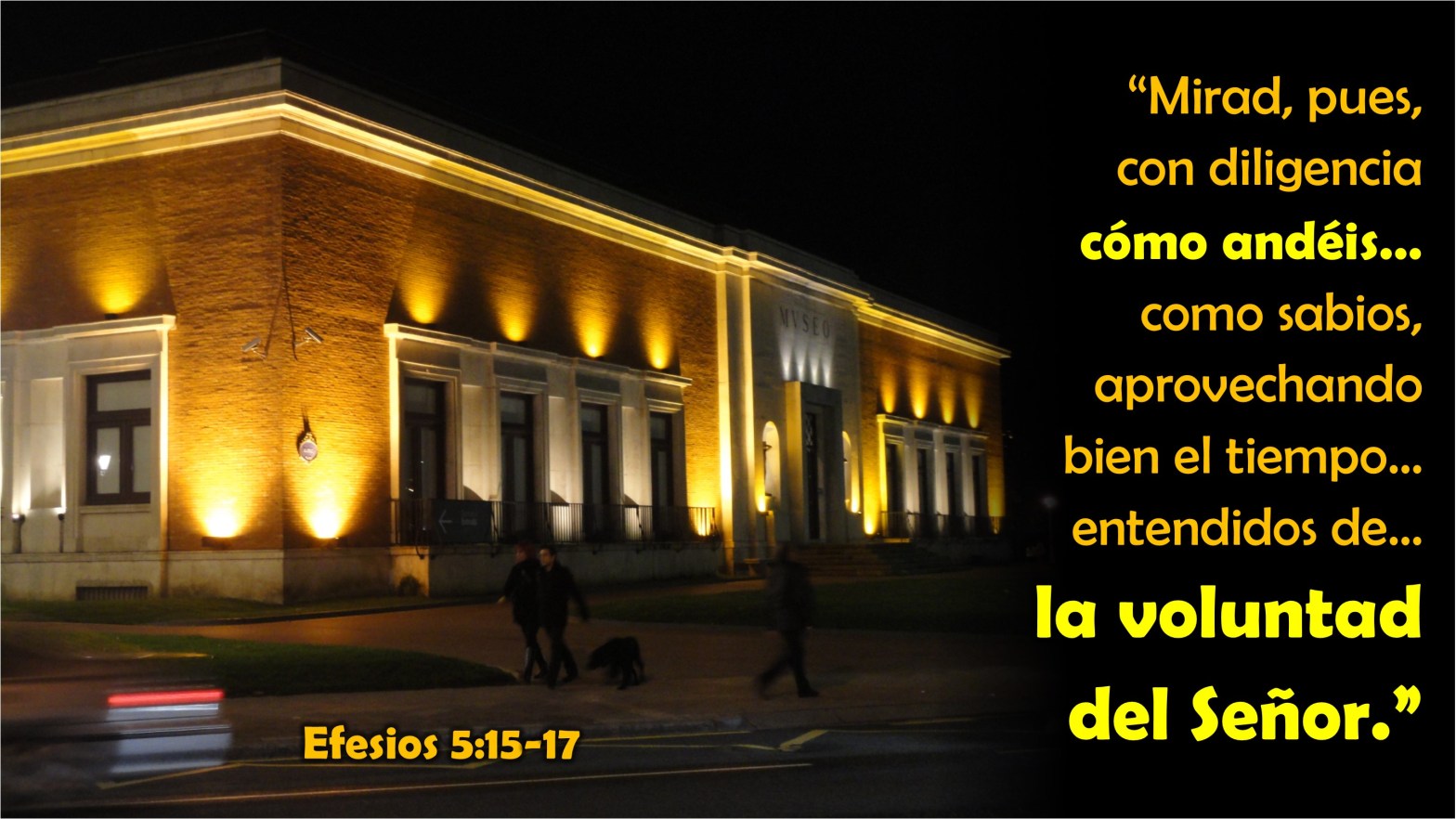 “Mirad, pues, con diligencia cómo andéis, no como necios sino como sabios, aprovechando bien el tiempo, porque los días son malos. Por tanto, no seáis insensatos, sino entendidos de cuál sea la voluntad del Señor.”