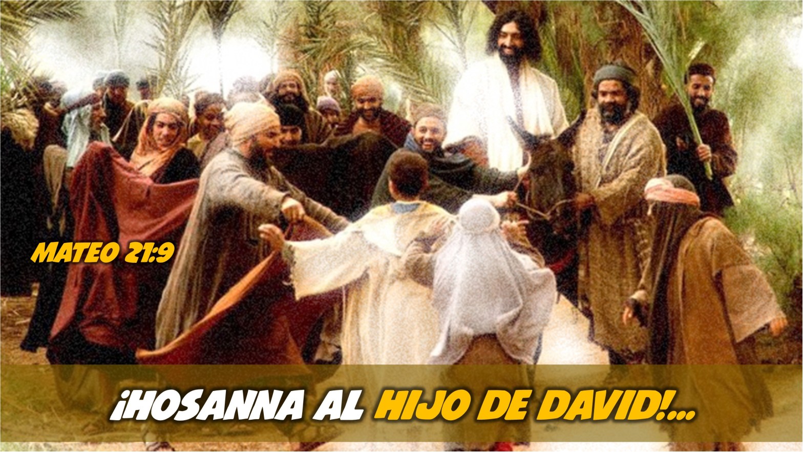 Y los discípulos fueron, e hicieron como Jesús les mandó; y trajeron el asna y el pollino, y pusieron sobre ellos sus mantos; y él se sentó encima. Y la multitud, que era muy numerosa, tendía sus mantos en el camino; y otros cortaban ramas de los árboles, y las tendían en el camino. Y la gente que iba delante y la que iba detrás aclamaba, diciendo: ¡Hosanna al Hijo de David! ¡Bendito el que viene en el nombre del Señor! ¡Hosanna en las alturas!”