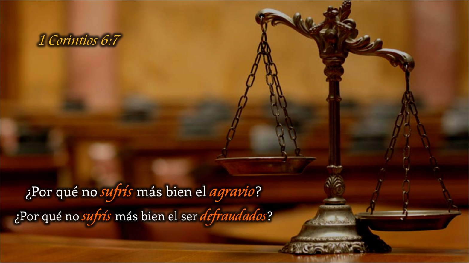 “¿Osa alguno de vosotros, cuando tiene algo contra otro, ir a juicio delante de los injustos, y no delante de los santos? […] Si, pues, tenéis juicios sobre cosas de esta vida, ¿ponéis para juzgar a los que son de menor estima en la iglesia? Para avergonzaros lo digo. ¿Pues qué, no hay entre vosotros sabio, ni aun uno, que pueda juzgar entre sus hermanos, sino que el hermano con el hermano pleitea en juicio, y esto ante los incrédulos? Así que, por cierto es ya una falta en vosotros que tengáis pleitos entre vosotros mismos. ¿Por qué no sufrís más bien el agravio? ¿Por qué no sufrís más bien el ser defraudados? Pero vosotros cometéis el agravio, y defraudáis, y esto a los hermanos.”