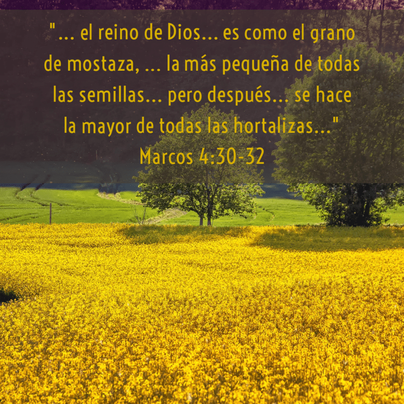 “Decía también: ¿A qué haremos semejante el reino de Dios, o con qué parábola lo compararemos? Es como el grano de mostaza, que cuando se siembra en tierra, es la más pequeña de todas las semillas que hay en la tierra; pero después de sembrado, crece, y se hace la mayor de todas las hortalizas, y echa grandes ramas, de tal manera que las aves del cielo pueden morar bajo su sombra.”
