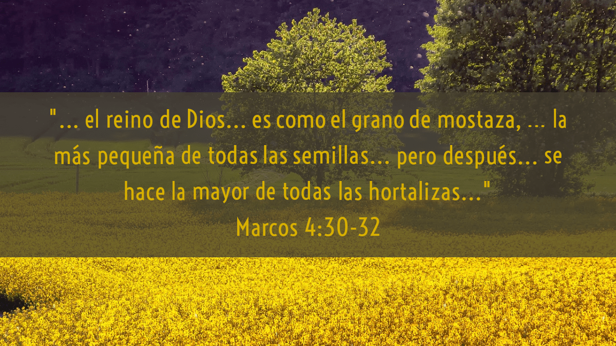 “Decía también: ¿A qué haremos semejante el reino de Dios, o con qué parábola lo compararemos? Es como el grano de mostaza, que cuando se siembra en tierra, es la más pequeña de todas las semillas que hay en la tierra; pero después de sembrado, crece, y se hace la mayor de todas las hortalizas, y echa grandes ramas, de tal manera que las aves del cielo pueden morar bajo su sombra.”