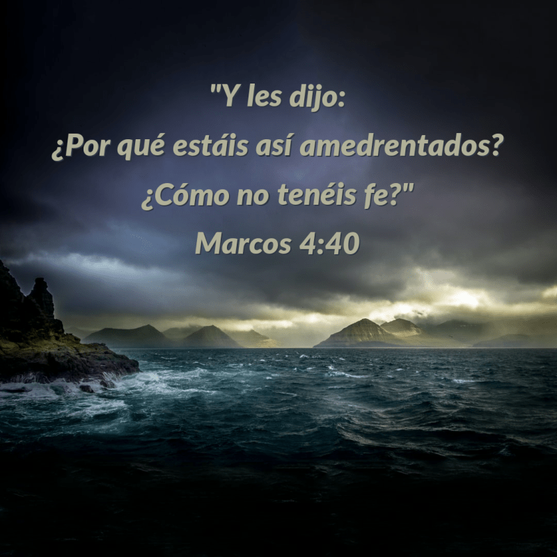 “Aquel día, cuando llegó la noche, les dijo: Pasemos al otro lado. Y despidiendo a la multitud, le tomaron como estaba, en la barca; y había también con él otras barcas. Pero se levantó una gran tempestad de viento, y echaba las olas en la barca, de tal manera que ya se anegaba. Y él estaba en la popa, durmiendo sobre un cabezal; y le despertaron, y le dijeron: Maestro, ¿no tienes cuidado que perecemos? Y levantándose, reprendió al viento, y dijo al mar: Calla, enmudece. Y cesó el viento, y se hizo grande bonanza. Y les dijo: ¿Por qué estáis así amedrentados? ¿Cómo no tenéis fe? Entonces temieron con gran temor, y se decían el uno al otro: ¿Quién es éste, que aun el viento y el mar le obedecen?”