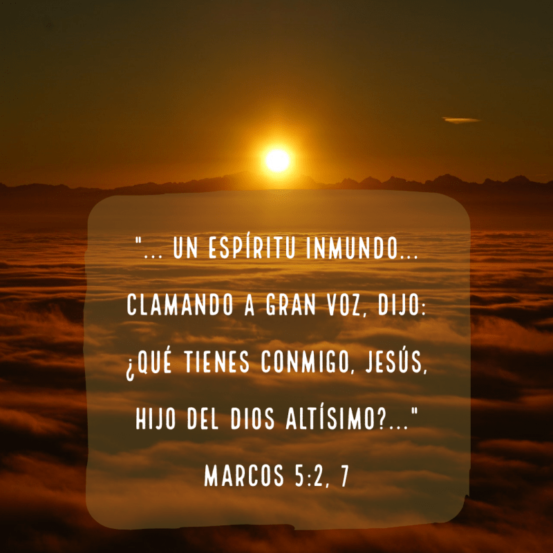 “Vinieron al otro lado del mar, a la región de los gadarenos. Y cuando salió él de la barca, en seguida vino a su encuentro, de los sepulcros, un hombre con un espíritu inmundo, que tenía su morada en los sepulcros, y nadie podía atarle, ni aun con cadenas. Porque muchas veces había sido atado con grillos y cadenas, mas las cadenas habían sido hechas pedazos por él, y desmenuzados los grillos; y nadie le podía dominar. Y siempre, de día y de noche, andaba dando voces en los montes y en los sepulcros, e hiriéndose con piedras. Cuando vio, pues, a Jesús de lejos, corrió, y se arrodilló ante él. Y clamando a gran voz, dijo: ¿Qué tienes conmigo, Jesús, Hijo del Dios Altísimo? Te conjuro por Dios que no me atormentes. Porque le decía: Sal de este hombre, espíritu inmundo. Y le preguntó: ¿Cómo te llamas? Y respondió diciendo: Legión me llamo; porque somos muchos. Y le rogaba mucho que no los enviase fuera de aquella región. Estaba allí cerca del monte un gran hato de cerdos paciendo. Y le rogaron todos los demonios, diciendo: Envíanos a los cerdos para que entremos en ellos. Y luego Jesús les dio permiso. Y saliendo aquellos espíritus inmundos, entraron en los cerdos, los cuales eran como dos mil; y el hato se precipitó en el mar por un despeñadero, y en el mar se ahogaron.”