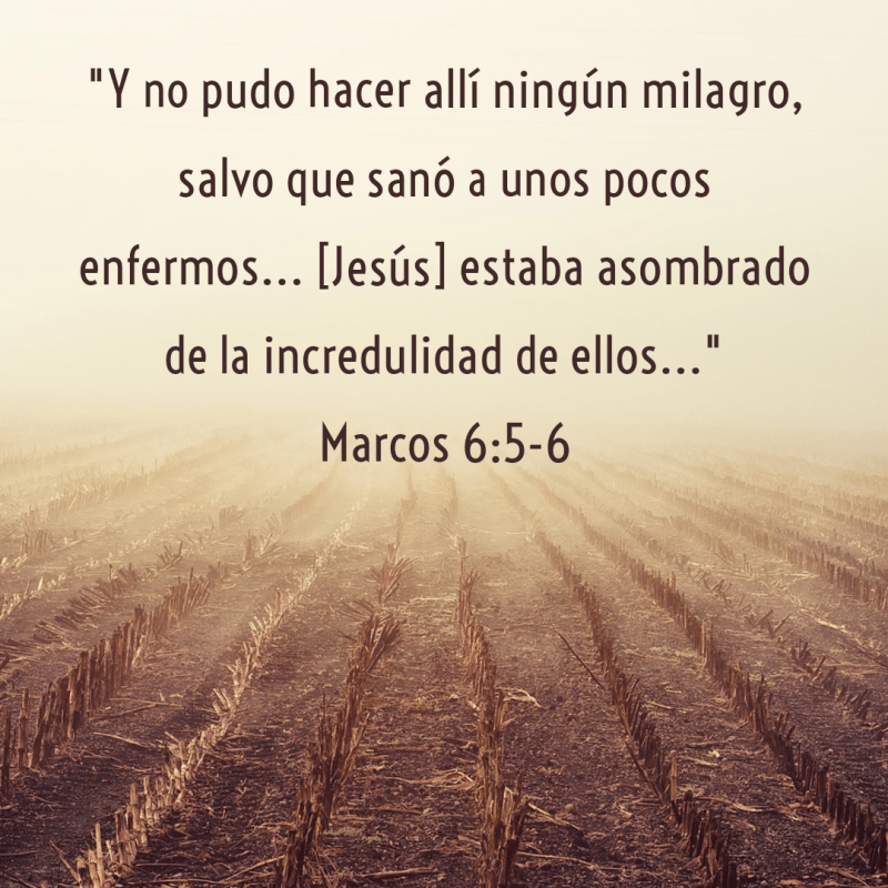 “Salió Jesús de allí y vino a su tierra, y le seguían sus discípulos. Y llegado el día de reposo, comenzó a enseñar en la sinagoga; y muchos, oyéndole, se admiraban, y decían: ¿De dónde tiene éste estas cosas? ¿Y qué sabiduría es esta que le es dada, y estos milagros que por sus manos son hechos? ¿No es éste el carpintero, hijo de María, hermano de Jacobo, de José, de Judas y de Simón? ¿No están también aquí con nosotros sus hermanas? Y se escandalizaban de él. Mas Jesús les decía: No hay profeta sin honra sino en su propia tierra, y entre sus parientes, y en su casa. Y no pudo hacer allí ningún milagro, salvo que sanó a unos pocos enfermos, poniendo sobre ellos las manos. Y estaba asombrado de la incredulidad de ellos. Y recorría las aldeas de alrededor, enseñando.”