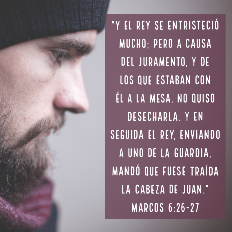 “Oyó el rey Herodes la fama de Jesús, porque su nombre se había hecho notorio; y dijo: Juan el Bautista ha resucitado de los muertos, y por eso actúan en él estos poderes. Otros decían: Es Elías. Y otros decían: Es un profeta, o alguno de los profetas. Al oír esto Herodes, dijo: Este es Juan, el que yo decapité, que ha resucitado de los muertos. Porque el mismo Herodes había enviado y prendido a Juan, y le había encadenado en la cárcel por causa de Herodías, mujer de Felipe su hermano; pues la había tomado por mujer. Porque Juan decía a Herodes: No te es lícito tener la mujer de tu hermano. Pero Herodías le acechaba, y deseaba matarle, y no podía; porque Herodes temía a Juan, sabiendo que era varón justo y santo, y le guardaba a salvo; y oyéndole, se quedaba muy perplejo, pero le escuchaba de buena gana. Pero venido un día oportuno, en que Herodes, en la fiesta de su cumpleaños, daba una cena a sus príncipes y tribunos y a los principales de Galilea, entrando la hija de Herodías, danzó, y agradó a Herodes y a los que estaban con él a la mesa; y el rey dijo a la muchacha: Pídeme lo que quieras, y yo te lo daré. Y le juró: Todo lo que me pidas te daré, hasta la mitad de mi reino. Saliendo ella, dijo a su madre: ¿Qué pediré? Y ella le dijo: La cabeza de Juan el Bautista. Entonces ella entró prontamente al rey, y pidió diciendo: Quiero que ahora mismo me des en un plato la cabeza de Juan el Bautista. Y el rey se entristeció mucho; pero a causa del juramento, y de los que estaban con él a la mesa, no quiso desecharla. Y en seguida el rey, enviando a uno de la guardia, mandó que fuese traída la cabeza de Juan. El guarda fue, le decapitó en la cárcel, y trajo su cabeza en un plato y la dio a la muchacha, y la muchacha la dio a su madre. Cuando oyeron esto sus discípulos, vinieron y tomaron su cuerpo, y lo pusieron en un sepulcro.”