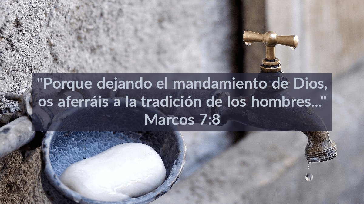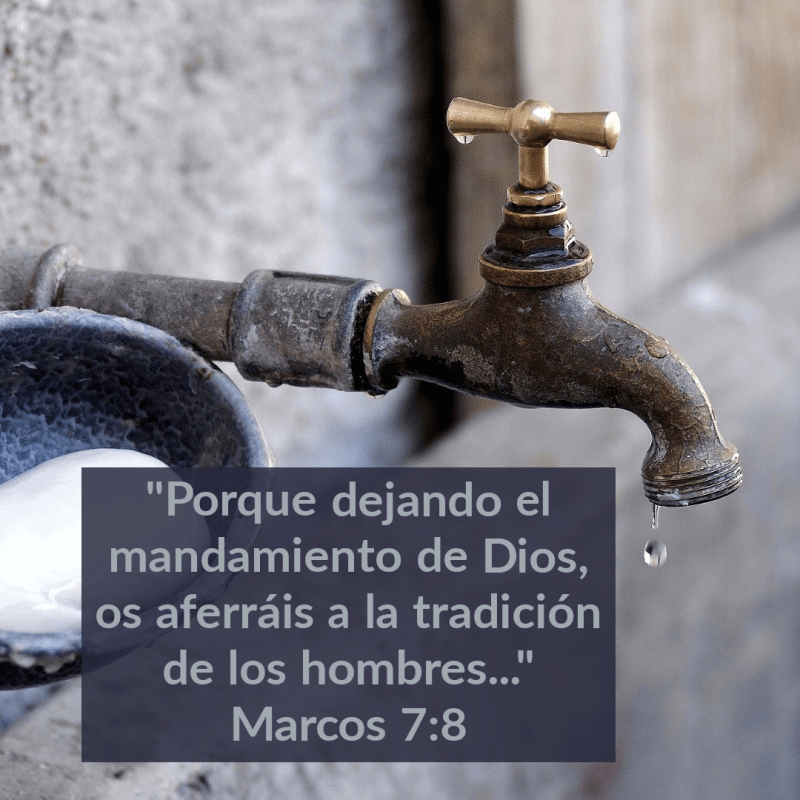 “Se juntaron a Jesús los fariseos, y algunos de los escribas, que habían venido de Jerusalén; los cuales, viendo a algunos de los discípulos de Jesús comer pan con manos inmundas, esto es, no lavadas, los condenaban. Porque los fariseos y todos los judíos, aferrándose a la tradición de los ancianos, si muchas veces no se lavan las manos, no comen. Y volviendo de la plaza, si no se lavan, no comen. Y otras muchas cosas hay que tomaron para guardar, como los lavamientos de los vasos de beber, y de los jarros, y de los utensilios de metal, y de los lechos. Le preguntaron, pues, los fariseos y los escribas: ¿Por qué tus discípulos no andan conforme a la tradición de los ancianos, sino que comen pan con manos inmundas? Respondiendo él, les dijo: Hipócritas, bien profetizó de vosotros Isaías, como está escrito: Este pueblo de labios me honra, Mas su corazón está lejos de mí. Pues en vano me honran, Enseñando como doctrinas mandamientos de hombres. Porque dejando el mandamiento de Dios, os aferráis a la tradición de los hombres: los lavamientos de los jarros y de los vasos de beber; y hacéis otras muchas cosas semejantes.”