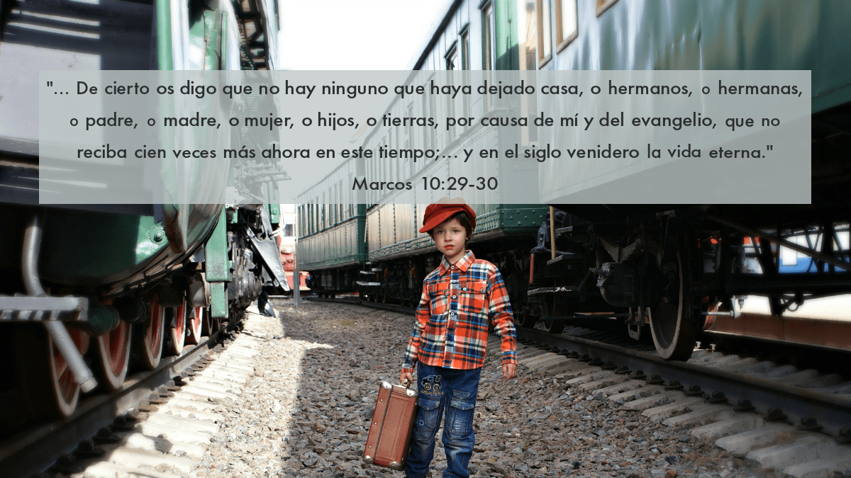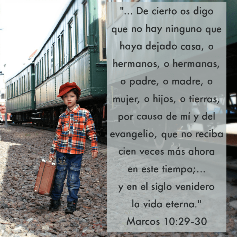 “Entonces Jesús, mirándole, le amó, y le dijo: Una cosa te falta: anda, vende todo lo que tienes, y dalo a los pobres, y tendrás tesoro en el cielo; y ven, sígueme, tomando tu cruz. Pero él, afligido por esta palabra, se fue triste, porque tenía muchas posesiones. Entonces Pedro comenzó a decirle: He aquí, nosotros lo hemos dejado todo, y te hemos seguido. Respondió Jesús y dijo: De cierto os digo que no hay ninguno que haya dejado casa, o hermanos, o hermanas, o padre, o madre, o mujer, o hijos, o tierras, por causa de mí y del evangelio, que no reciba cien veces más ahora en este tiempo; casas, hermanos, hermanas, madres, hijos, y tierras, con persecuciones; y en el siglo venidero la vida eterna. Pero muchos primeros serán postreros, y los postreros, primeros.”