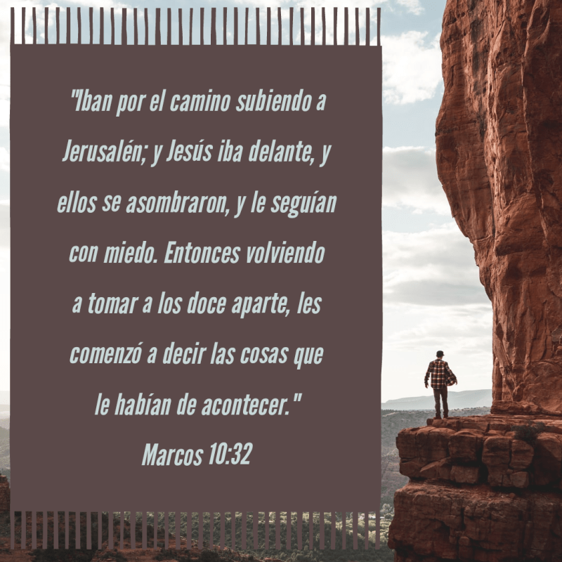 “Iban por el camino subiendo a Jerusalén; y Jesús iba delante, y ellos se asombraron, y le seguían con miedo. Entonces volviendo a tomar a los doce aparte, les comenzó a decir las cosas que le habían de acontecer: He aquí subimos a Jerusalén, y el Hijo del Hombre será entregado a los principales sacerdotes y a los escribas, y le condenarán a muerte, y le entregarán a los gentiles; y le escarnecerán, le azotarán, y escupirán en él, y le matarán; mas al tercer día resucitará.”