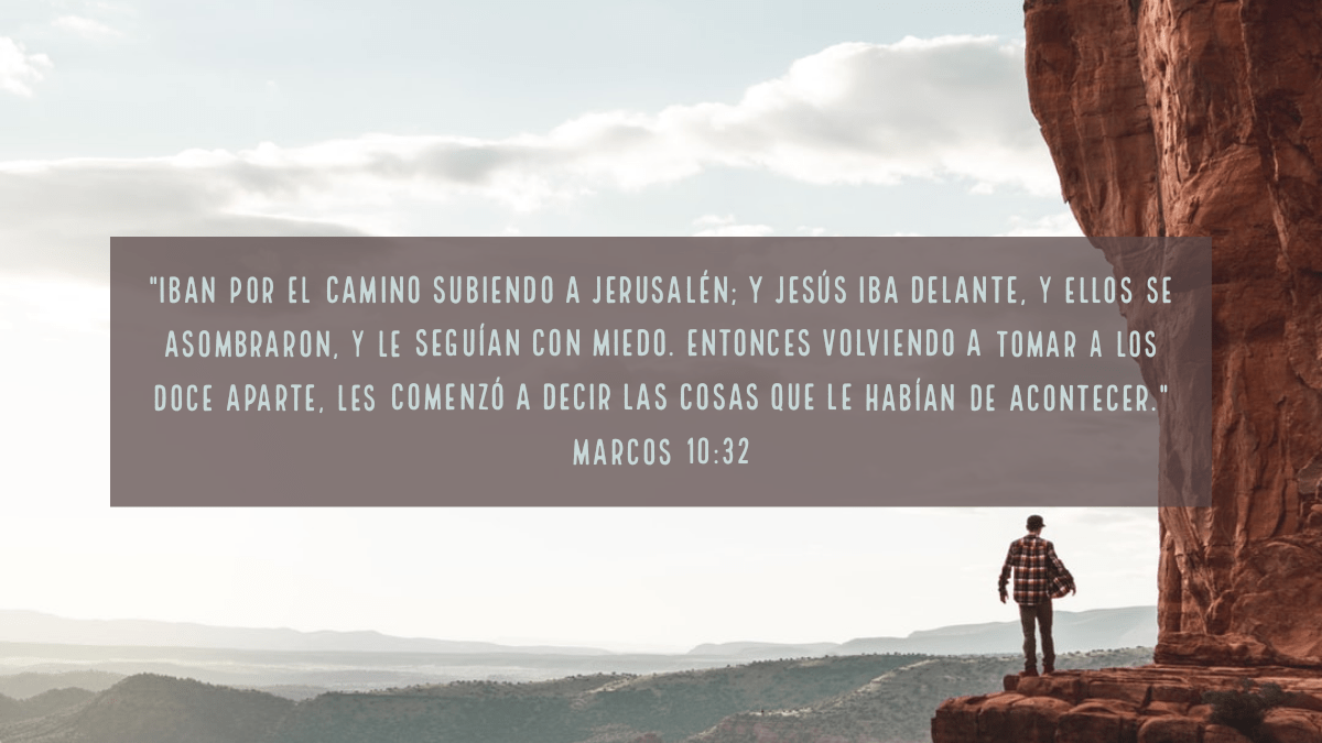 “Iban por el camino subiendo a Jerusalén; y Jesús iba delante, y ellos se asombraron, y le seguían con miedo. Entonces volviendo a tomar a los doce aparte, les comenzó a decir las cosas que le habían de acontecer: He aquí subimos a Jerusalén, y el Hijo del Hombre será entregado a los principales sacerdotes y a los escribas, y le condenarán a muerte, y le entregarán a los gentiles; y le escarnecerán, le azotarán, y escupirán en él, y le matarán; mas al tercer día resucitará.”