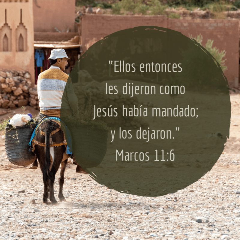 “Cuando se acercaban a Jerusalén, junto a Betfagé y a Betania, frente al monte de los Olivos, Jesús envió dos de sus discípulos, y les dijo: Id a la aldea que está enfrente de vosotros, y luego que entréis en ella, hallaréis un pollino atado, en el cual ningún hombre ha montado; desatadlo y traedlo. Y si alguien os dijere: ¿Por qué hacéis eso? decid que el Señor lo necesita, y que luego lo devolverá. Fueron, y hallaron el pollino atado afuera a la puerta, en el recodo del camino, y lo desataron. Y unos de los que estaban allí les dijeron: ¿Qué hacéis desatando el pollino? Ellos entonces les dijeron como Jesús había mandado; y los dejaron.”