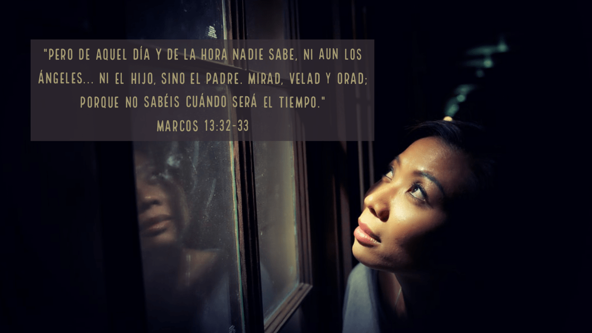 “Pero de aquel día y de la hora nadie sabe, ni aun los ángeles que están en el cielo, ni el Hijo, sino el Padre. Mirad, velad y orad; porque no sabéis cuándo será el tiempo. Es como el hombre que yéndose lejos, dejó su casa, y dio autoridad a sus siervos, y a cada uno su obra, y al portero mandó que velase. Velad, pues, porque no sabéis cuándo vendrá el señor de la casa; si al anochecer, o a la medianoche, o al canto del gallo, o a la mañana; para que cuando venga de repente, no os halle durmiendo. Y lo que a vosotros digo, a todos lo digo: Velad.”