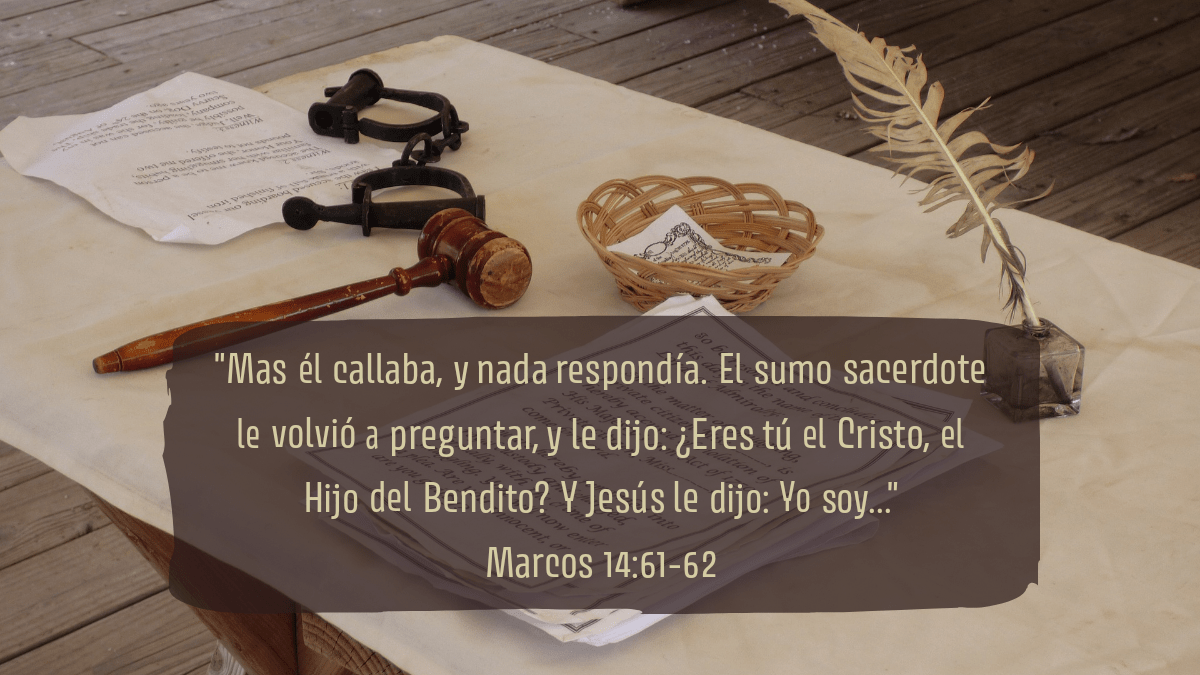 “Trajeron, pues, a Jesús al sumo sacerdote; y se reunieron todos los principales sacerdotes y los ancianos y los escribas. Y Pedro le siguió de lejos hasta dentro del patio del sumo sacerdote; y estaba sentado con los alguaciles, calentándose al fuego. Y los principales sacerdotes y todo el concilio buscaban testimonio contra Jesús, para entregarle a la muerte; pero no lo hallaban. Porque muchos decían falso testimonio contra él, mas sus testimonios no concordaban. Entonces levantándose unos, dieron falso testimonio contra él, diciendo: Nosotros le hemos oído decir: Yo derribaré este templo hecho a mano, y en tres días edificaré otro hecho sin mano. Pero ni aun así concordaban en el testimonio. Entonces el sumo sacerdote, levantándose en medio, preguntó a Jesús, diciendo: ¿No respondes nada? ¿Qué testifican éstos contra ti? Mas él callaba, y nada respondía. El sumo sacerdote le volvió a preguntar, y le dijo: ¿Eres tú el Cristo, el Hijo del Bendito? Y Jesús le dijo: Yo soy; y veréis al Hijo del Hombre sentado a la diestra del poder de Dios, y viniendo en las nubes del cielo. Entonces el sumo sacerdote, rasgando su vestidura, dijo: ¿Qué más necesidad tenemos de testigos? Habéis oído la blasfemia; ¿qué os parece? Y todos ellos le condenaron, declarándole ser digno de muerte. Y algunos comenzaron a escupirle, y a cubrirle el rostro y a darle de puñetazos, y a decirle: Profetiza. Y los alguaciles le daban de bofetadas.”