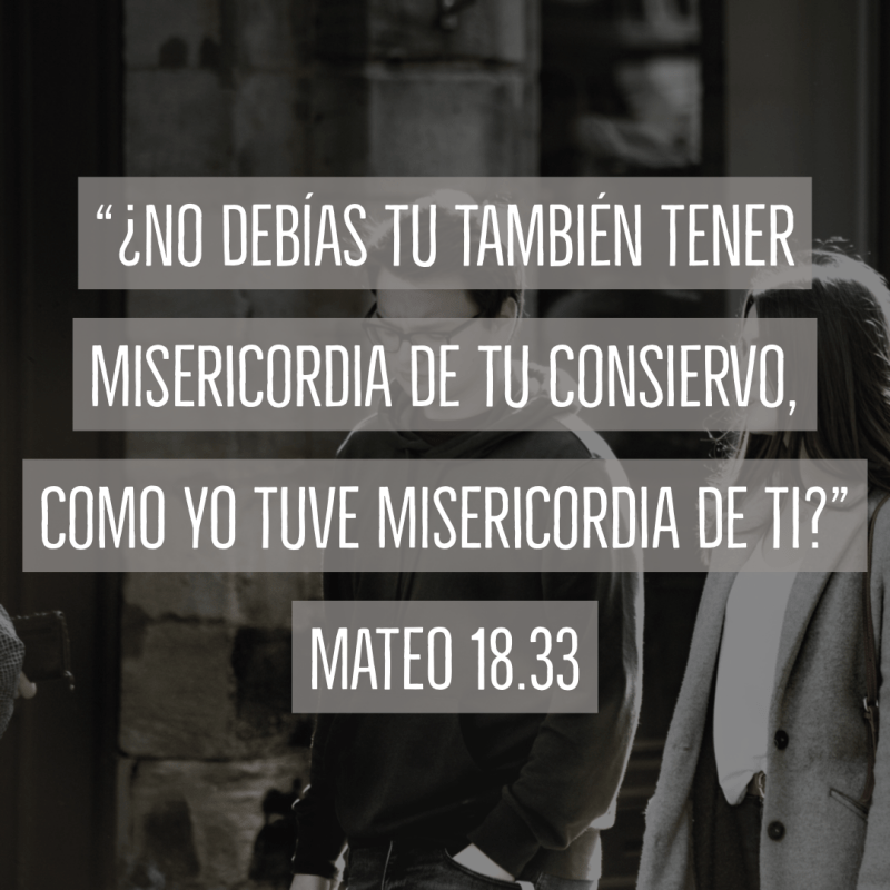 “Por lo cual el reino de los cielos es semejante a un rey que quiso hacer cuentas con sus siervos. Y comenzando a hacer cuentas, le fue presentado uno que le debía diez mil talentos. A este, como no pudo pagar, ordenó su señor venderle, y a su mujer e hijos, y todo lo que tenía, para que se le pagase la deuda. Entonces aquel siervo, postrado, le suplicaba, diciendo: Señor, ten paciencia conmigo, y yo te lo pagaré todo. El señor de aquel siervo, movido a misericordia, le soltó y le perdonó la deuda. Pero saliendo aquel siervo, halló a uno de sus consiervos, que le debía cien denarios; y asiendo de él, le ahogaba, diciendo: Págame lo que me debes. Entonces su consiervo, postrándose a sus pies, le rogaba diciendo: Ten paciencia conmigo, y yo te lo pagaré todo. Mas él no quiso, sino fue y le echó en la cárcel, hasta que pagase la deuda. […] Entonces, llamándole su señor, le dijo: Siervo malvado, toda aquella deuda te perdoné, porque me rogaste. ¿No debías tú también tener misericordia de tu consiervo, como yo tuve misericordia de ti? Entonces su señor, enojado, le entregó a los verdugos, hasta que pagase todo lo que le debía. Así también mi Padre celestial hará con vosotros si no perdonáis de todo corazón cada uno a su hermano sus ofensas.”