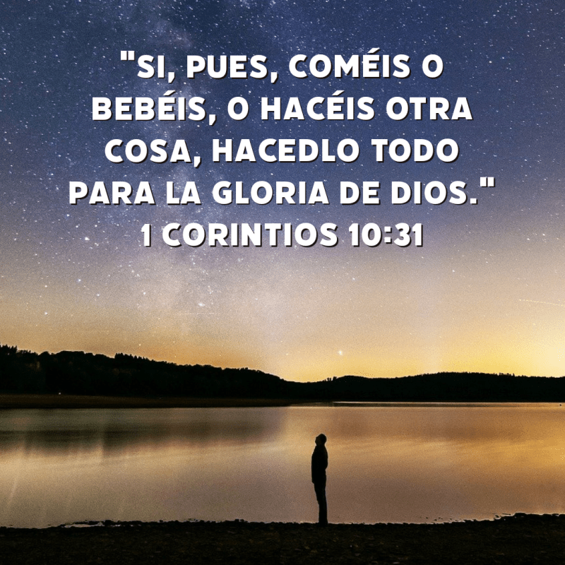 “Todo me es lícito, pero no todo conviene; todo me es lícito, pero no todo edifica. Ninguno busque su propio bien, sino el del otro. De todo lo que se vende en la carnicería, comed, sin preguntar nada por motivos de conciencia; porque del Señor es la tierra y su plenitud. Si algún incrédulo os invita, y queréis ir, de todo lo que se os ponga delante comed, sin preguntar nada por motivos de conciencia. Mas si alguien os dijere: Esto fue sacrificado a los ídolos; no lo comáis, por causa de aquel que lo declaró, y por motivos de conciencia; porque del Señor es la tierra y su plenitud. La conciencia, digo, no la tuya, sino la del otro. Pues ¿por qué se ha de juzgar mi libertad por la conciencia de otro? Y si yo con agradecimiento participo, ¿por qué he de ser censurado por aquello de que doy gracias? Si, pues, coméis o bebéis, o hacéis otra cosa, hacedlo todo para la gloria de Dios. No seáis tropiezo ni a judíos, ni a gentiles, ni a la iglesia de Dios; como también yo en todas las cosas agrado a todos, no procurando mi propio beneficio, sino el de muchos, para que sean salvos.”