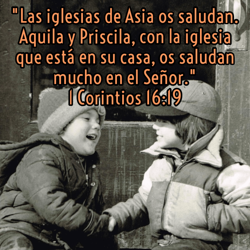 “Las iglesias de Asia os saludan. Aquila y Priscila, con la iglesia que está en su casa, os saludan mucho en el Señor. Os saludan todos los hermanos. Saludaos los unos a los otros con ósculo santo. Yo, Pablo, os escribo esta salutación de mi propia mano. El que no amare al Señor Jesucristo, sea anatema. El Señor viene. La gracia del Señor Jesucristo esté con vosotros. Mi amor en Cristo Jesús esté con todos vosotros. Amén.”