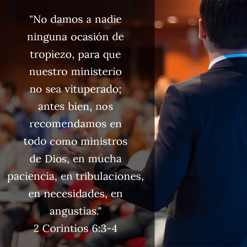 “No damos a nadie ninguna ocasión de tropiezo, para que nuestro ministerio no sea vituperado; antes bien, nos recomendamos en todo como ministros de Dios, en mucha paciencia, en tribulaciones, en necesidades, en angustias; en azotes, en cárceles, en tumultos, en trabajos, en desvelos, en ayunos; en pureza, en ciencia, en longanimidad, en bondad, en el Espíritu Santo, en amor sincero, en palabra de verdad, en poder de Dios, con armas de justicia a diestra y a siniestra; por honra y por deshonra, por mala fama y por buena fama; como engañadores, pero veraces; como desconocidos, pero bien conocidos; como moribundos, mas he aquí vivimos; como castigados, mas no muertos; como entristecidos, mas siempre gozosos; como pobres, mas enriqueciendo a muchos; como no teniendo nada, mas poseyéndolo todo. Nuestra boca se ha abierto a vosotros, oh corintios; nuestro corazón se ha ensanchado. No estáis estrechos en nosotros, pero sí sois estrechos en vuestro propio corazón. Pues, para corresponder del mismo modo (como a hijos hablo), ensanchaos también vosotros.”
