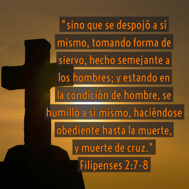 “Haya, pues, en vosotros este sentir que hubo también en Cristo Jesús, el cual, siendo en forma de Dios, no estimó el ser igual a Dios como cosa a que aferrarse, sino que se despojó a sí mismo, tomando forma de siervo, hecho semejante a los hombres; y estando en la condición de hombre, se humilló a sí mismo, haciéndose obediente hasta la muerte, y muerte de cruz. Por lo cual Dios también le exaltó hasta lo sumo, y le dio un nombre que es sobre todo nombre, para que en el nombre de Jesús se doble toda rodilla de los que están en los cielos, y en la tierra, y debajo de la tierra; y toda lengua confiese que Jesucristo es el Señor, para gloria de Dios Padre.”