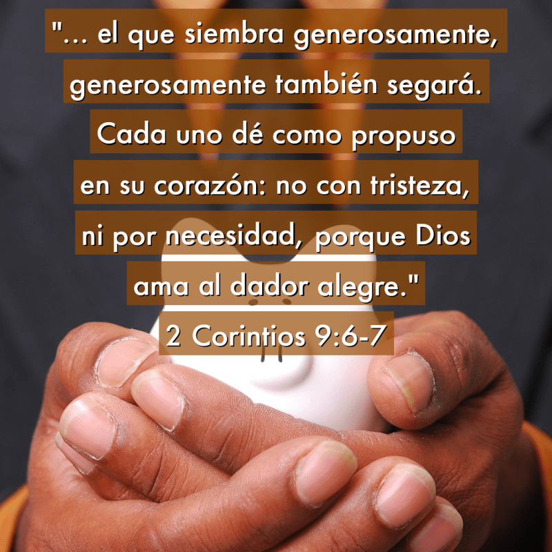 “Cuanto a la ministración para los santos, es por demás que yo os escriba; pues conozco vuestra buena voluntad, de la cual yo me glorío entre los de Macedonia, que Acaya está preparada desde el año pasado; y vuestro celo ha estimulado a la mayoría. Pero he enviado a los hermanos, para que nuestro gloriarnos de vosotros no sea vano en esta parte; para que como lo he dicho, estéis preparados; no sea que si vinieren conmigo algunos macedonios, y os hallaren desprevenidos, nos avergoncemos nosotros, por no decir vosotros, de esta nuestra confianza. Por tanto, tuve por necesario exhortar a los hermanos que fuesen primero a vosotros y preparasen primero vuestra generosidad antes prometida, para que esté lista como de generosidad, y no como de exigencia nuestra. Pero esto digo: El que siembra escasamente, también segará escasamente; y el que siembra generosamente, generosamente también segará. Cada uno dé como propuso en su corazón: no con tristeza, ni por necesidad, porque Dios ama al dador alegre.”