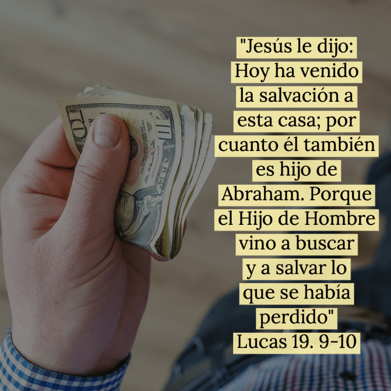 “Cuando Jesús llegó a aquel lugar, mirando hacia arriba, le vio, y le dijo: Zaqueo, date prisa, desciende, porque hoy es necesario que pose yo en tu casa. Entonces él descendió aprisa, y le recibió gozoso. Al ver esto, todos murmuraban, diciendo que había entrado a posar con un hombre pecador. Entonces Zaqueo, puesto en pie, dijo al Señor: He aquí, Señor, la mitad de mis bienes doy a los pobres; y si en algo he defraudado a alguno, se lo devuelvo cuadruplicado. Jesús le dijo: Hoy ha venido la salvación a esta casa; por cuanto él también es hijo de Abraham. Porque el Hijo del Hombre vino a buscar y a salvar lo que se había perdido.”