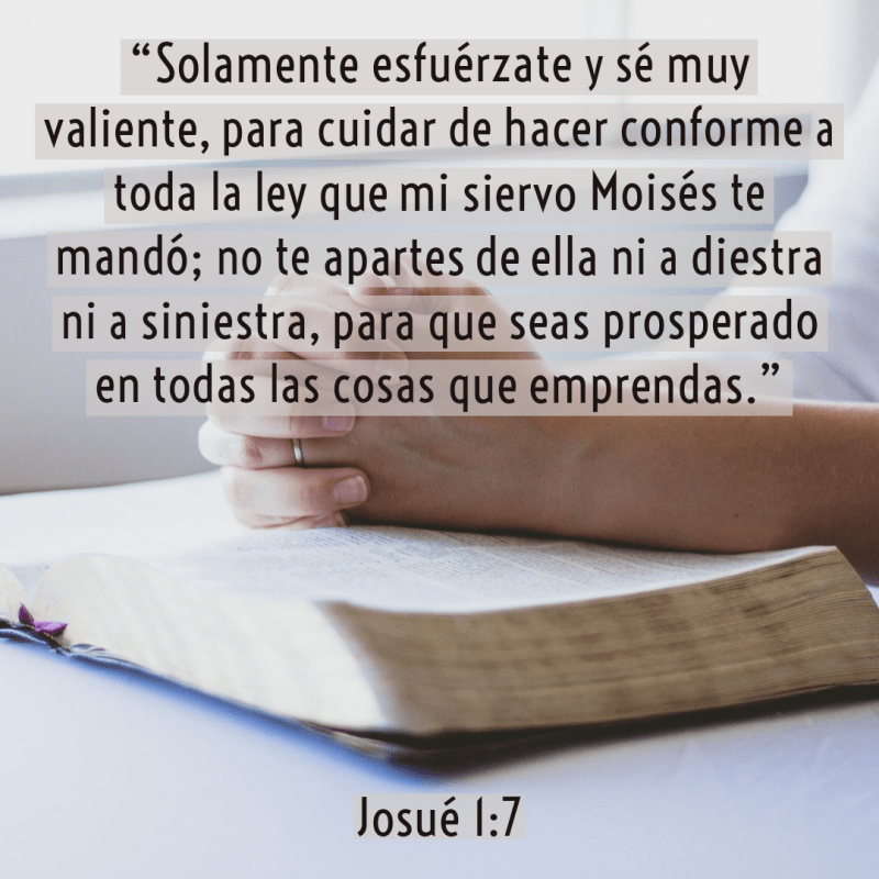 “Nadie te podrá hacer frente en todos los días de tu vida; como estuve con Moisés, estaré contigo; no te dejaré, ni te desampararé. Esfuérzate y sé valiente; porque tú repartirás a este pueblo por heredad la tierra de la cual juré a sus padres que la daría a ellos. Solamente esfuérzate y sé muy valiente, para cuidar de hacer conforme a toda la ley que mi siervo Moisés te mandó; no te apartes de ella ni a diestra ni a siniestra, para que seas prosperado en todas las cosas que emprendas. Nunca se apartará de tu boca este libro de la ley, sino que de día y de noche meditarás en él, para que guardes y hagas conforme a todo lo que en él está escrito; porque entonces harás prosperar tu camino, y todo te saldrá bien. Mira que te mando que te esfuerces y seas valiente; no temas ni desmayes, porque Jehová tu Dios estará contigo en dondequiera que vayas.”