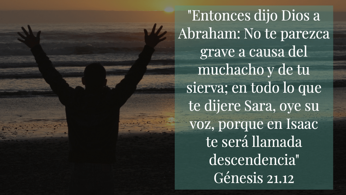 “Y vio Sara que el hijo de Agar la egipcia, el cual esta le había dado a luz a Abraham, se burlaba de su hijo Isaac. Por tanto, dijo a Abraham: Echa a esta sierva y a su hijo, porque el hijo de esta sierva no ha de heredar con Isaac mi hijo. Este dicho pareció grave en gran manera a Abraham a causa de su hijo. Entonces dijo Dios a Abraham: No te parezca grave a causa del muchacho y de tu sierva; en todo lo que te dijere Sara, oye su voz, porque en Isaac te será llamada descendencia.”