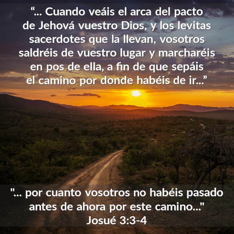 “Josué se levantó de mañana, y él y todos los hijos de Israel partieron de Sitim y vinieron hasta el Jordán, y reposaron allí antes de pasarlo. Y después de tres días, los oficiales recorrieron el campamento, y mandaron al pueblo, diciendo: Cuando veáis el arca del pacto de Jehová vuestro Dios, y los levitas sacerdotes que la llevan, vosotros saldréis de vuestro lugar y marcharéis en pos de ella, a fin de que sepáis el camino por donde habéis de ir; por cuanto vosotros no habéis pasado antes de ahora por este camino. Pero entre vosotros y ella haya distancia como de dos mil codos; no os acercaréis a ella.”