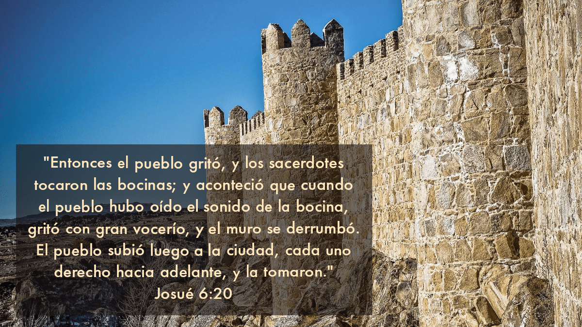 “Y los hombres armados iban delante de los sacerdotes que tocaban las bocinas, y la retaguardia iba tras el arca, mientras las bocinas sonaban continuamente. Y Josué mandó al pueblo, diciendo: Vosotros no gritaréis, ni se oirá vuestra voz, ni saldrá palabra de vuestra boca, hasta el día que yo os diga: Gritad; entonces gritaréis. Así que él hizo que el arca de Jehová diera una vuelta alrededor de la ciudad, y volvieron luego al campamento, y allí pasaron la noche. Y Josué se levantó de mañana, y los sacerdotes tomaron el arca de Jehová. Y los siete sacerdotes, llevando las siete bocinas de cuerno de carnero, fueron delante del arca de Jehová, andando siempre y tocando las bocinas; y los hombres armados iban delante de ellos, y la retaguardia iba tras el arca de Jehová, mientras las bocinas tocaban continuamente. Así dieron otra vuelta a la ciudad el segundo día, y volvieron al campamento; y de esta manera hicieron durante seis días. Al séptimo día se levantaron al despuntar el alba, y dieron vuelta a la ciudad de la misma manera siete veces; solamente este día dieron vuelta alrededor de ella siete veces. Y cuando los sacerdotes tocaron las bocinas la séptima vez, Josué dijo al pueblo: Gritad, porque Jehová os ha entregado la ciudad. […] Entonces el pueblo gritó, y los sacerdotes tocaron las bocinas; y aconteció que cuando el pueblo hubo oído el sonido de la bocina, gritó con gran vocerío, y el muro se derrumbó. El pueblo subió luego a la ciudad, cada uno derecho hacia adelante, y la tomaron. Y destruyeron a filo de espada todo lo que en la ciudad había; hombres y mujeres, jóvenes y viejos, hasta los bueyes, las ovejas, y los asnos.”