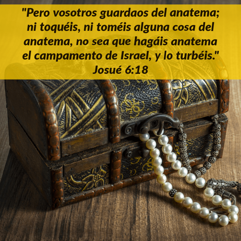 “Y será la ciudad anatema a Jehová, con todas las cosas que están en ella; solamente Rahab la ramera vivirá, con todos los que estén en casa con ella, por cuanto escondió a los mensajeros que enviamos. Pero vosotros guardaos del anatema; ni toquéis, ni toméis alguna cosa del anatema, no sea que hagáis anatema el campamento de Israel, y lo turbéis. Mas toda la plata y el oro, y los utensilios de bronce y de hierro, sean consagrados a Jehová, y entren en el tesoro de Jehová.”