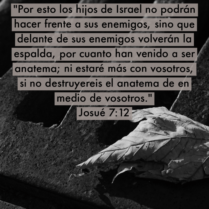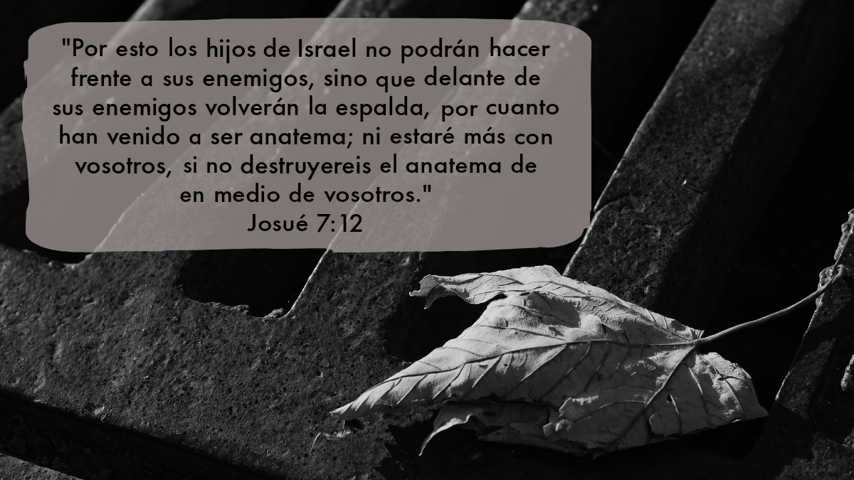 “Y Jehová dijo a Josué: Levántate; ¿por qué te postras así sobre tu rostro? Israel ha pecado, y aun han quebrantado mi pacto que yo les mandé; y también han tomado del anatema, y hasta han hurtado, han mentido, y aun lo han guardado entre sus enseres. Por esto los hijos de Israel no podrán hacer frente a sus enemigos, sino que delante de sus enemigos volverán la espalda, por cuanto han venido a ser anatema; ni estaré más con vosotros, si no destruyereis el anatema de en medio de vosotros. Levántate, santifica al pueblo, y di: Santificaos para mañana; porque Jehová el Dios de Israel dice así: Anatema hay en medio de ti, Israel; no podrás hacer frente a tus enemigos, hasta que hayáis quitado el anatema de en medio de vosotros. Os acercaréis, pues, mañana por vuestras tribus; y la tribu que Jehová tomare, se acercará por sus familias; y la familia que Jehová tomare, se acercará por sus casas; y la casa que Jehová tomare, se acercará por los varones; y el que fuere sorprendido en el anatema, será quemado, él y todo lo que tiene, por cuanto ha quebrantado el pacto de Jehová, y ha cometido maldad en Israel.”