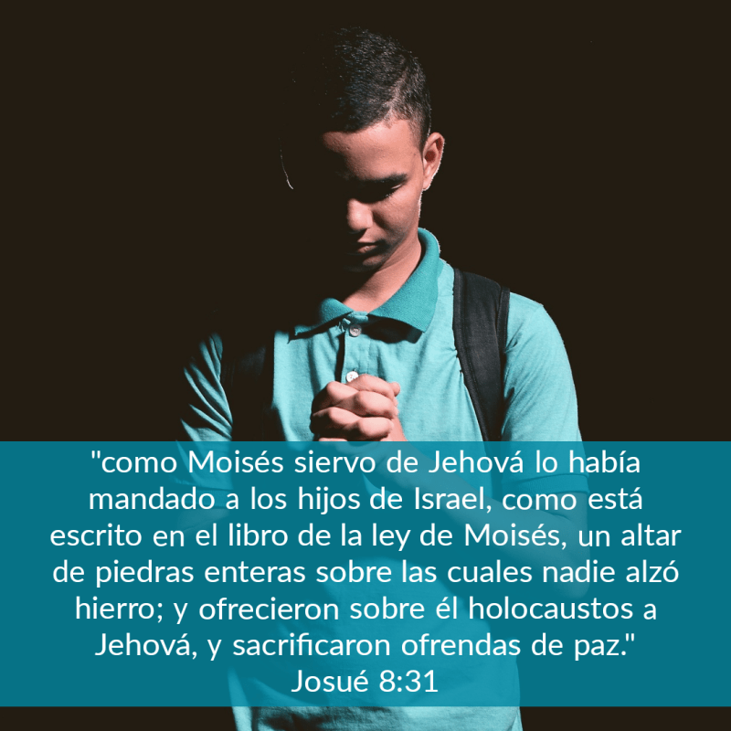 “Entonces Josué edificó un altar a Jehová Dios de Israel en el monte Ebal, como Moisés siervo de Jehová lo había mandado a los hijos de Israel, como está escrito en el libro de la ley de Moisés, un altar de piedras enteras sobre las cuales nadie alzó hierro; y ofrecieron sobre él holocaustos a Jehová, y sacrificaron ofrendas de paz. También escribió allí sobre las piedras una copia de la ley de Moisés, la cual escribió delante de los hijos de Israel. Y todo Israel, con sus ancianos, oficiales y jueces, estaba de pie a uno y otro lado del arca, en presencia de los sacerdotes levitas que llevaban el arca del pacto de Jehová, así los extranjeros como los naturales. La mitad de ellos estaba hacia el monte Gerizim, y la otra mitad hacia el monte Ebal, de la manera que Moisés, siervo de Jehová, lo había mandado antes, para que bendijesen primeramente al pueblo de Israel. Después de esto, leyó todas las palabras de la ley, las bendiciones y las maldiciones, conforme a todo lo que está escrito en el libro de la ley. No hubo palabra alguna de todo cuanto mandó Moisés, que Josué no hiciese leer delante de toda la congregación de Israel, y de las mujeres, de los niños, y de los extranjeros que moraban entre ellos.”