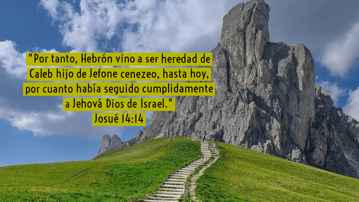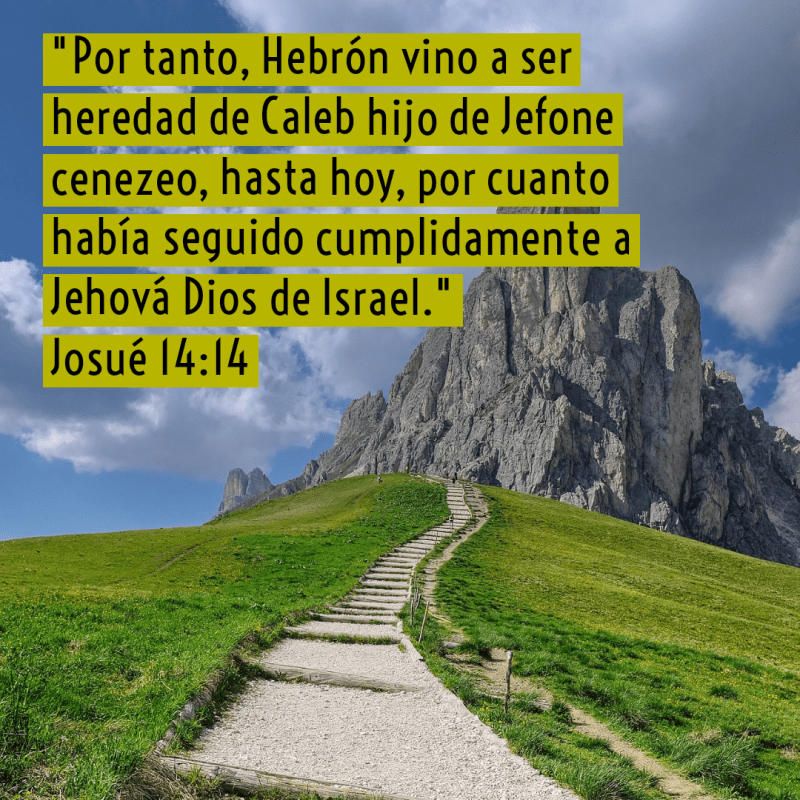 “Y los hijos de Judá vinieron a Josué en Gilgal; y Caleb, hijo de Jefone cenezeo, le dijo: Tú sabes lo que Jehová dijo a Moisés, varón de Dios, en Cades-barnea, tocante a mí y a ti. Yo era de edad de cuarenta años cuando Moisés siervo de Jehová me envió de Cades-barnea a reconocer la tierra; y yo le traje noticias como lo sentía en mi corazón. Y mis hermanos, los que habían subido conmigo, hicieron desfallecer el corazón del pueblo; pero yo cumplí siguiendo a Jehová mi Dios. Entonces Moisés juró diciendo: Ciertamente la tierra que holló tu pie será para ti, y para tus hijos en herencia perpetua, por cuanto cumpliste siguiendo a Jehová mi Dios. Ahora bien, Jehová me ha hecho vivir, como él dijo, estos cuarenta y cinco años, desde el tiempo que Jehová habló estas palabras a Moisés, cuando Israel andaba por el desierto; y ahora, he aquí, hoy soy de edad de ochenta y cinco años. Todavía estoy tan fuerte como el día que Moisés me envió; cual era mi fuerza entonces, tal es ahora mi fuerza para la guerra, y para salir y para entrar. Dame, pues, ahora este monte, del cual habló Jehová aquel día; porque tú oíste en aquel día que los anaceos están allí, y que hay ciudades grandes y fortificadas. Quizá Jehová estará conmigo, y los echaré, como Jehová ha dicho. Josué entonces le bendijo, y dio a Caleb hijo de Jefone a Hebrón por heredad. Por tanto, Hebrón vino a ser heredad de Caleb hijo de Jefone cenezeo, hasta hoy, por cuanto había seguido cumplidamente a Jehová Dios de Israel. Mas el nombre de Hebrón fue antes Quiriat-arba; porque Arba fue un hombre grande entre los anaceos. Y la tierra descansó de la guerra.”