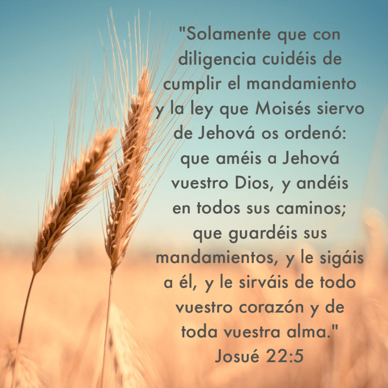“Entonces Josué llamó a los rubenitas, a los gaditas, y a la media tribu de Manasés, y les dijo: Vosotros habéis guardado todo lo que Moisés siervo de Jehová os mandó, y habéis obedecido a mi voz en todo lo que os he mandado. No habéis dejado a vuestros hermanos en este largo tiempo hasta el día de hoy, sino que os habéis cuidado de guardar los mandamientos de Jehová vuestro Dios. Ahora, pues, que Jehová vuestro Dios ha dado reposo a vuestros hermanos, como lo había prometido, volved, regresad a vuestras tiendas, a la tierra de vuestras posesiones, que Moisés siervo de Jehová os dio al otro lado del Jordán. Solamente que con diligencia cuidéis de cumplir el mandamiento y la ley que Moisés siervo de Jehová os ordenó: que améis a Jehová vuestro Dios, y andéis en todos sus caminos; que guardéis sus mandamientos, y le sigáis a él, y le sirváis de todo vuestro corazón y de toda vuestra alma. Y bendiciéndolos, Josué los despidió, y se fueron a sus tiendas. También a la media tribu de Manasés había dado Moisés posesión en Basán; mas a la otra mitad dio Josué heredad entre sus hermanos a este lado del Jordán, al occidente; y también a éstos envió Josué a sus tiendas, después de haberlos bendecido. Y les habló diciendo: Volved a vuestras tiendas con grandes riquezas, con mucho ganado, con plata, con oro, y bronce, y muchos vestidos; compartid con vuestros hermanos el botín de vuestros enemigos.”