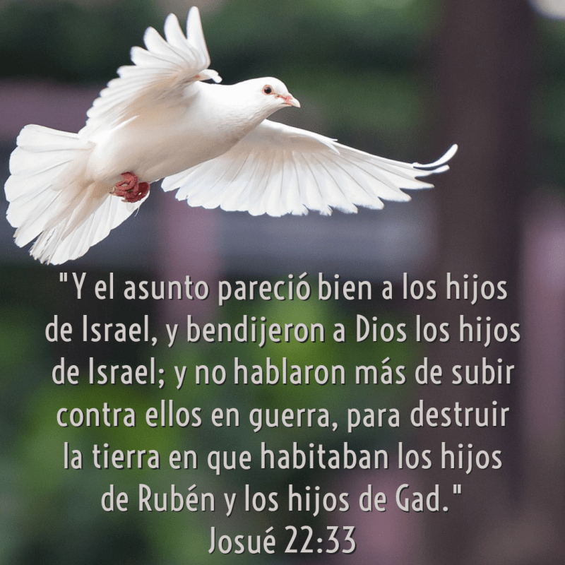 “Y enviaron los hijos de Israel a los hijos de Rubén y a los hijos de Gad y a la media tribu de Manasés en tierra de Galaad, a Finees hijo del sacerdote Eleazar, y a diez príncipes con él: un príncipe por cada casa paterna de todas las tribus de Israel, cada uno de los cuales era jefe de la casa de sus padres entre los millares de Israel. Los cuales fueron a los hijos de Rubén y a los hijos de Gad y a la media tribu de Manasés, en la tierra de Galaad, y les hablaron diciendo: Toda la congregación de Jehová dice así: ¿Qué transgresión es esta con que prevaricáis contra el Dios de Israel para apartaros hoy de seguir a Jehová, edificándoos altar para ser rebeldes contra Jehová? ¿No ha sido bastante la maldad de Peor, de la que no estamos aún limpios hasta este día, por la cual vino la mortandad en la congregación de Jehová, para que vosotros os apartéis hoy de seguir a Jehová? Vosotros os rebeláis hoy contra Jehová, y mañana se airará él contra toda la congregación de Israel. […] Entonces los hijos de Rubén y los hijos de Gad y la media tribu de Manasés respondieron y dijeron a los cabezas de los millares de Israel: Jehová Dios de los dioses, Jehová Dios de los dioses, él sabe, y hace saber a Israel: si fue por rebelión o por prevaricación contra Jehová, no nos salves hoy. Si nos hemos edificado altar para volvernos de en pos de Jehová, o para sacrificar holocausto u ofrenda, o para ofrecer sobre él ofrendas de paz, el mismo Jehová nos lo demande. Lo hicimos más bien por temor de que mañana vuestros hijos digan a nuestros hijos: ¿Qué tenéis vosotros con Jehová Dios de Israel? Jehová ha puesto por lindero el Jordán entre nosotros y vosotros, oh hijos de Rubén e hijos de Gad; no tenéis vosotros parte en Jehová; y así vuestros hijos harían que nuestros hijos dejasen de temer a Jehová. Por esto dijimos: Edifiquemos ahora un altar, no para holocausto ni para sacrificio, sino para que sea un testimonio entre nosotros y vosotros, y entre los que vendrán después de nosotros, de que podemos hacer el servicio de Jehová delante de él con nuestros holocaustos, con nuestros sacrificios y con nuestras ofrendas de paz; y no digan mañana vuestros hijos a los nuestros: Vosotros no tenéis parte en Jehová. […] Y el asunto pareció bien a los hijos de Israel, y bendijeron a Dios los hijos de Israel; y no hablaron más de subir contra ellos en guerra, para destruir la tierra en que habitaban los hijos de Rubén y los hijos de Gad.”