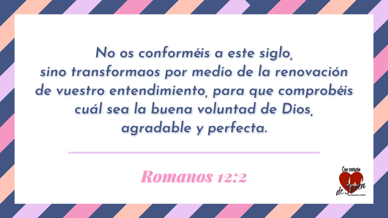 El versículo se refiere a que no nos dejemos amoldar por este mundo, por lo que el mundo nos ofrece, por lo que Satanás nos ofrece. Si queremos llevar una vida en santidad debemos alejarnos del pecado y no permitir que estas cosas entren a nuestra mente, sino que nuestra mente vaya siendo transformada, vaya siendo cambiada, vaya dando pasitos, para llegar a entender lo que Dios quiere para nuestra vida y para llegar cada vez a parecernos más a Jesucristo.