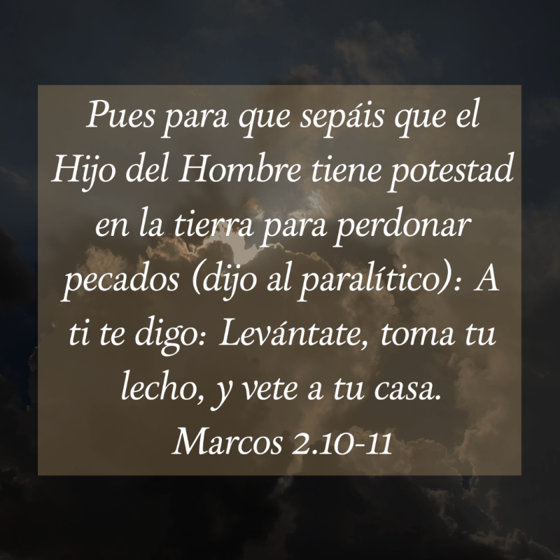 “Y conociendo luego Jesús en su espíritu que cavilaban de esta manera dentro de sí mismos, les dijo: ¿Por qué caviláis así en vuestros corazones? ¿Qué es más fácil, decir al paralítico: Tus pecados te son perdonados, o decirle: Levántate, toma tu lecho y anda? Pues para que sepáis que el Hijo del Hombre tiene potestad en la tierra para perdonar pecados (dijo al paralítico): A ti te digo: Levántate, toma tu lecho, y vete a tu casa.”
