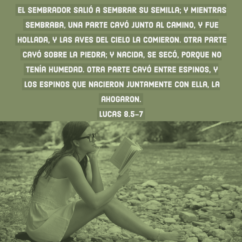 “El sembrador salió a sembrar su semilla; y mientras sembraba, una parte cayó junto al camino, y fue hollada, y las aves del cielo la comieron. Otra parte cayó sobre la piedra; y nacida, se secó, porque no tenía humedad. Otra parte cayó entre espinos, y los espinos que nacieron juntamente con ella, la ahogaron.”