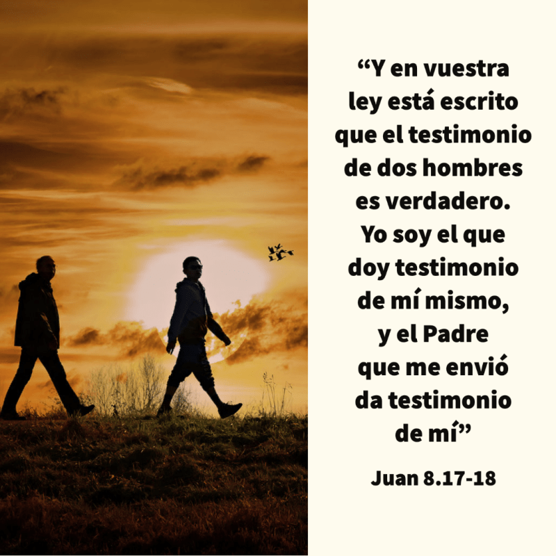 “Entonces los fariseos le dijeron: Tú das testimonio acerca de ti mismo; tu testimonio no es verdadero. Respondió Jesús y les dijo: Aunque yo doy testimonio acerca de mí mismo, mi testimonio es verdadero, porque sé de dónde he venido y a dónde voy; pero vosotros no sabéis de dónde vengo, ni a dónde voy. […] Y en vuestra ley está escrito que el testimonio de dos hombres es verdadero. Yo soy el que doy testimonio de mí mismo, y el Padre que me envió da testimonio de mí.”